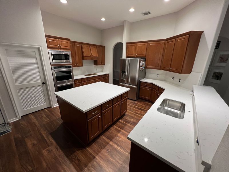 We complete sink, cooktop, faucet, soap dispenser, and any accessories (like RO holes), plus any mitered edges/waterfalls if ordered.