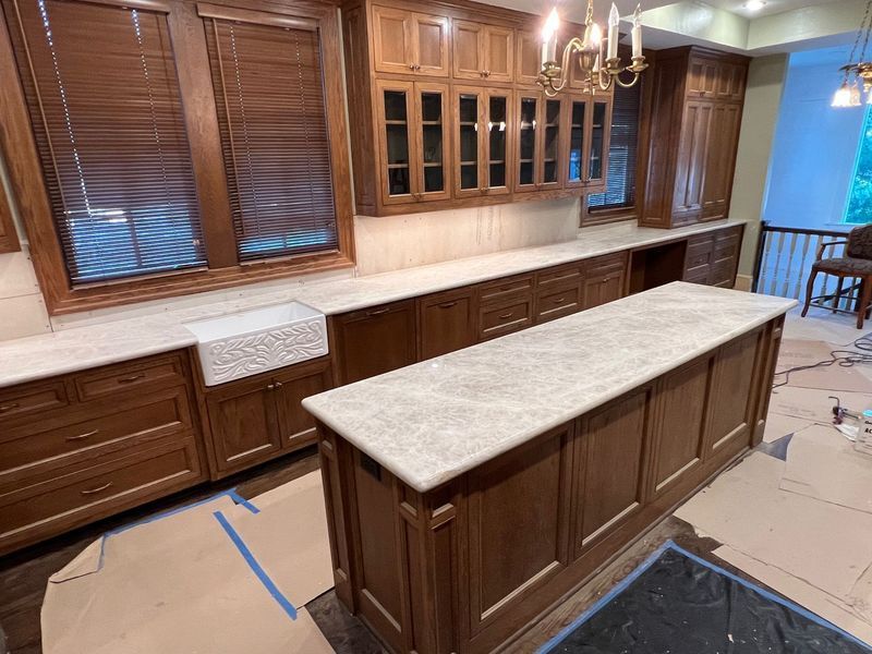 You choose your slab(s). We plan seam locations, vein flow (especially for Taj Mahal quartzite), and sink placement.